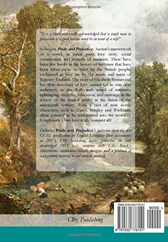 “It is a truth universally acknowledged that a single man in possession of a good fortune must be in want of a wife” So begins Pride and Prejudice, Austen’s masterwork of a novel, in equal parts love story, social commentary and comedy of manners. There have been few books in the history of literature that have been taken more to heart by the British people, enchanted as they are by the twists and turns of Regency England. The story of Elizabeth Bennet and her slow discovery of love cannot fail to win over audiences, as she deals with issues of manners, upbringing, morality, education, and marriage in the society of the landed gentry at the dawn of the nineteenth century. With a cast of now iconic characters, such as Darcy, Bingley and Wickham, allow yourself to be transported into the world of Longbourn. Does love really conquer all? Following Pride and Prejudice’s inclusion upon the new GCSE specification for English Literature (first assessments in 2017), CBy Publishing hereby publishes the full, unabridged 1813 text, complete with C.E. Brock’s illustrations, annotation-friendly margins and a plethora of background material to aid student analysis. What has this student edition got over other editions? Wide margins that you can annotate in Original text, word for word. Background information Designed for the new English GCSE Approved and tested on students! Once you buy a CBy Student Edition book, you’ll never buy anything else again! Visit www.cbypublishing.co.uk to view our full range of products.